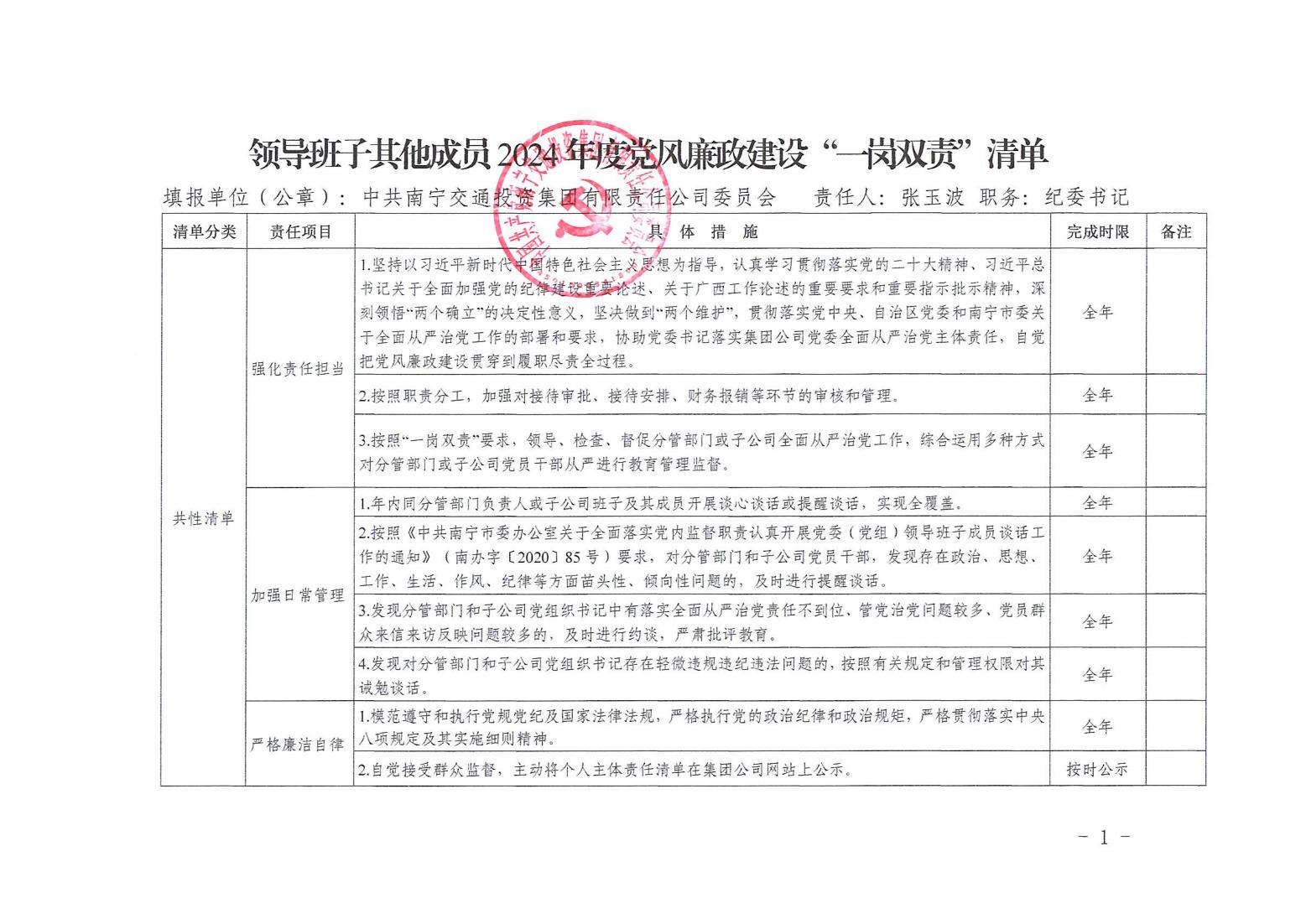 領導班子其他成員2024年度黨風廉政建設“一崗雙責”清單(一)
