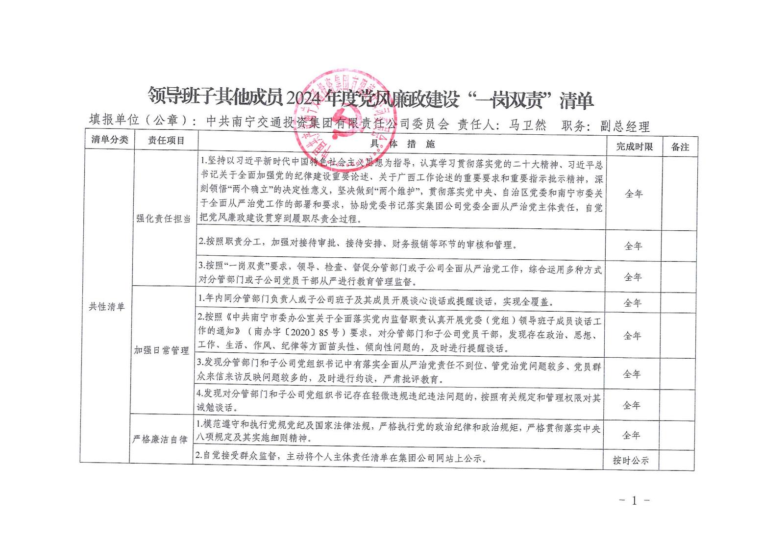 領導班子其他成員2024年度黨風廉政建設“一崗雙責”清單(四)