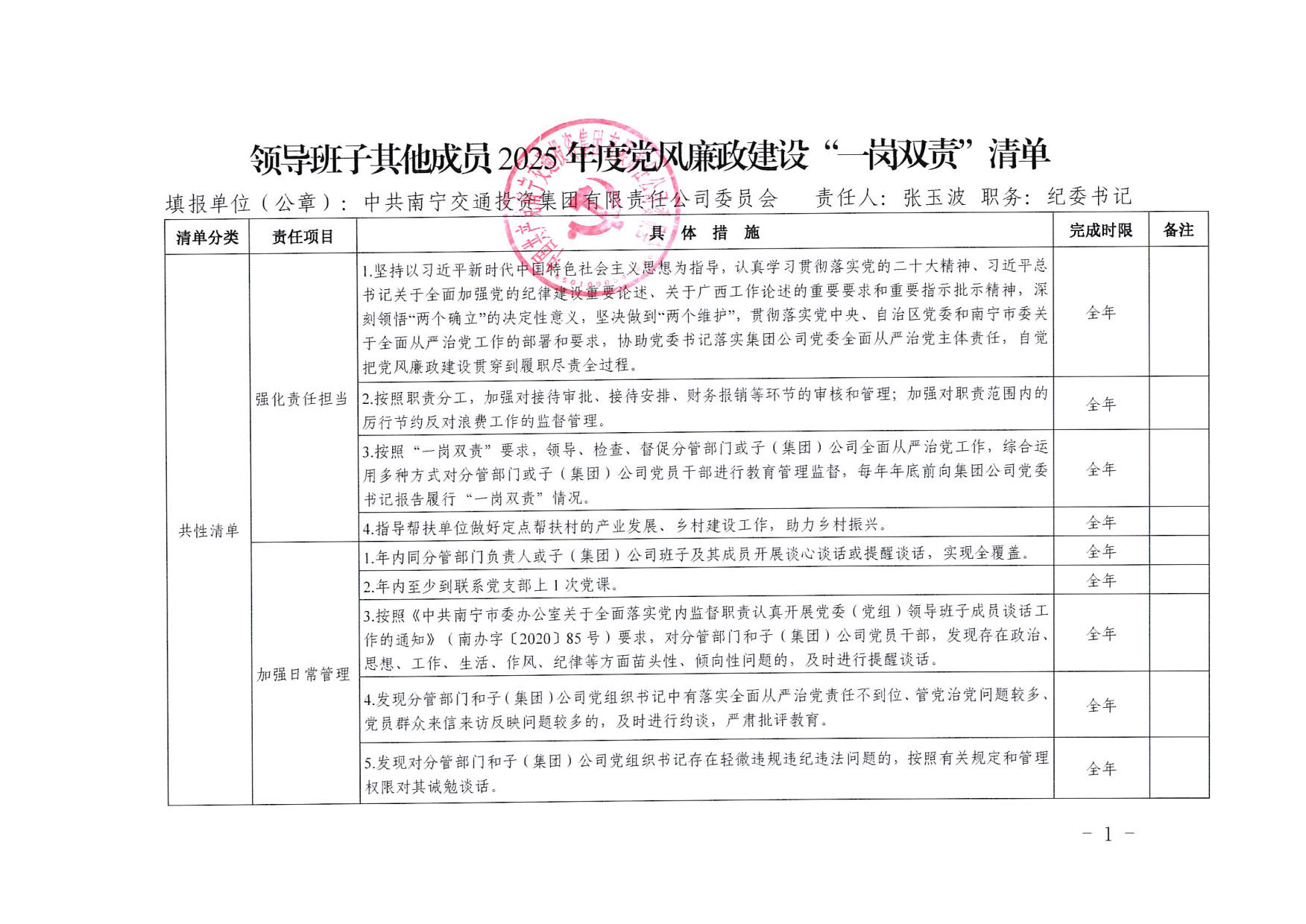 南寧交投集團領(lǐng)導班子其他成員2025年度黨風廉政建設(shè)“一崗雙責”清單(一)
