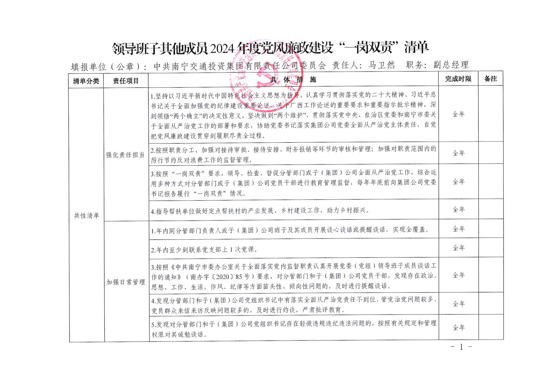 南寧交投集團(tuán)領(lǐng)導(dǎo)班子其他成員2025年度黨風(fēng)廉政建設(shè)“一崗雙責(zé)”清單(五)