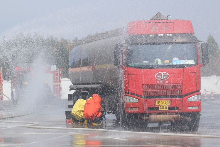 上午10時(shí)30分,演練正式開始,模擬場(chǎng)景為一輛載有?;愤\(yùn)輸車在服務(wù)區(qū)發(fā)生泄漏。服務(wù)區(qū)工作人員發(fā)現(xiàn)險(xiǎn)情后,立即啟動(dòng)?;沸孤?yīng)急預(yù)案,同時(shí)向高速交警、消防、醫(yī)療及環(huán)保等部門上報(bào)信息,并組織服務(wù)區(qū)工作人員封鎖現(xiàn)場(chǎng)、疏散周邊車輛及人員。